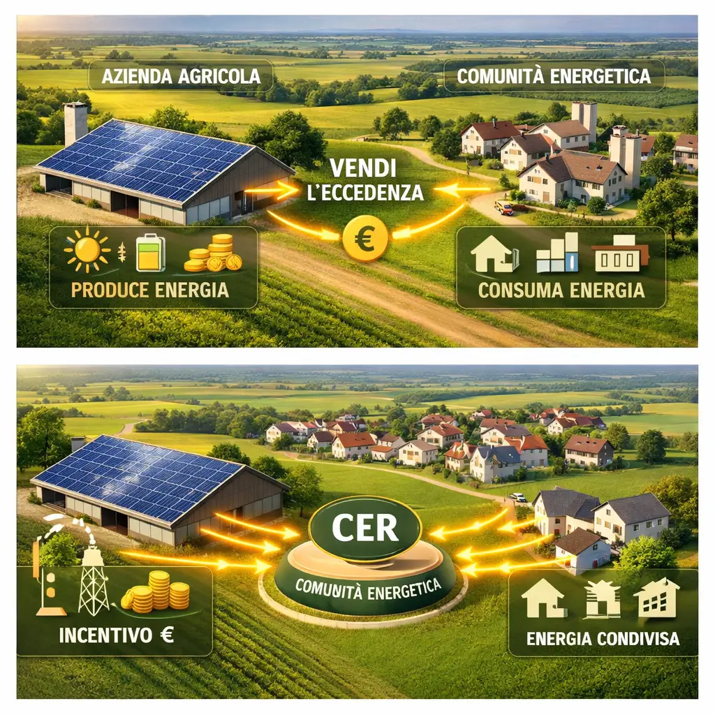 Se l’azienda aderisce a una Comunità Energetica Rinnovabile (CER), l’energia prodotta in eccesso può essere condivisa con la comunità e ricevere l’incentivo GSE sull’energia condivisa per 20 anni.